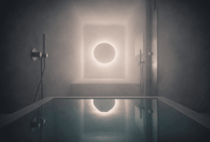 サウナ室内にはシャワー設備が備えられているため、全身がくまなく温まった状態で身体を冷やすことが可能です。サウナ室内やサウナ室付近にチラー設備を備えた水風呂を設置し、温熱から冷却までをスムーズに完結させる動線を確保しました。本格サウナユーザーにも応える設計でありながら、穏やかな蒸気と温度調節機能により、初めての方でも無理なく利用できるバランスを意識しました。